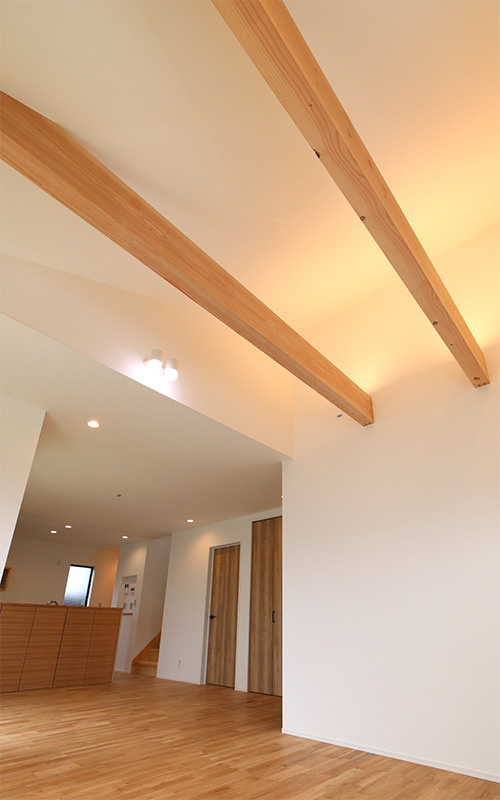 高い天井と勾配天井を設けることで、高窓から自然光をふんだんに取り入れることができます。