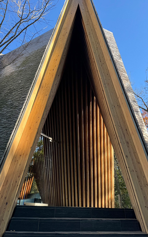 狭山湖と多摩湖の間の陸地に立つ狭山の森礼拝堂は、日本を代表する有名な建築家であるNAP建築設計事務所の中村拓志さんが設計しました。