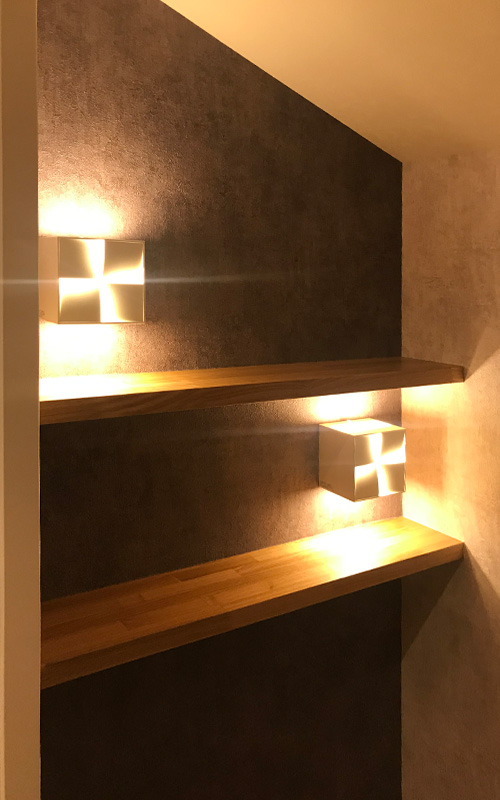 天井が勾配なのでダウンライトではなく壁付けにして、飾り棚と組み合わせました。