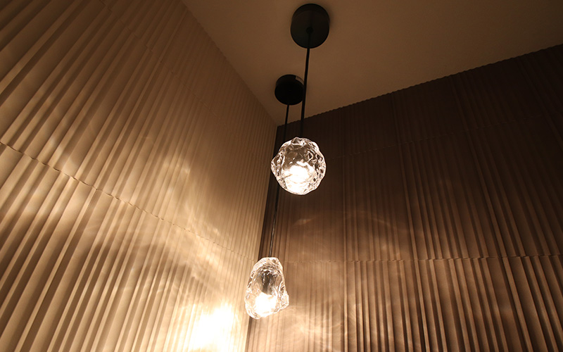 氷の隕石のようなキラメキのペンダントライトから出るフレアが、まさに小宇宙のようです!(こじつけではなく想像力です!)