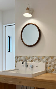 こちらは、木枠の丸ミラーとタイルが特徴的な洗面です。