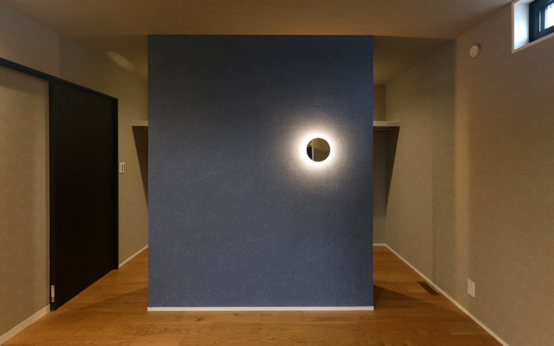 ヌルデニムの壁にお月様のような照明を取り付けました。