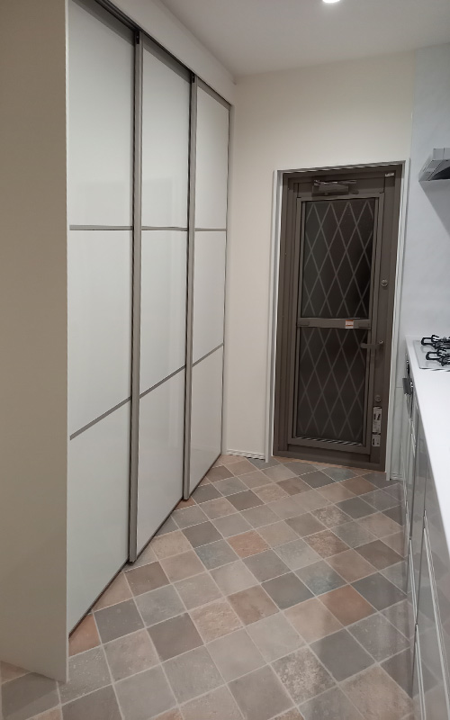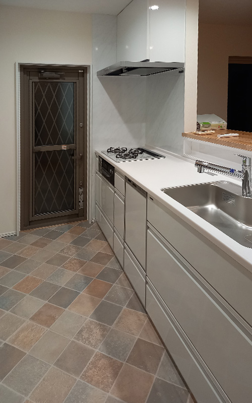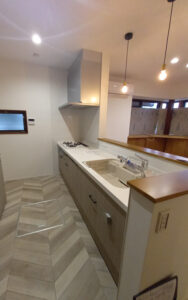 キッチンの扉色と合わせて選んで頂いているので、統一感もありながらヘリンボーンの柄で少しかわいらしい印象になります。