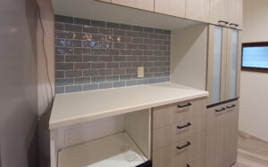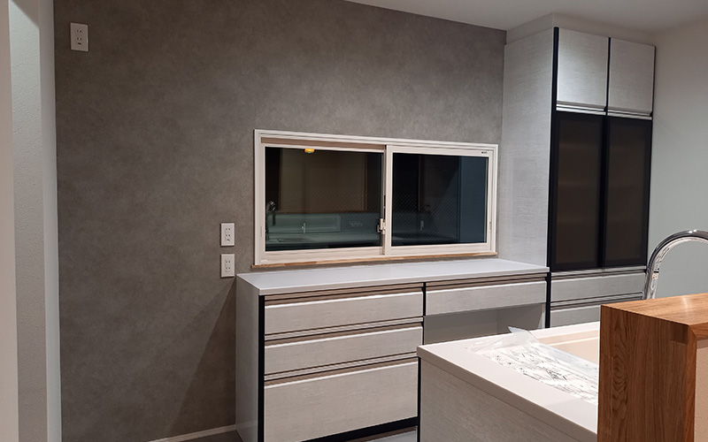 カップボードには一部ブルーグレー色のタイルを貼っています。