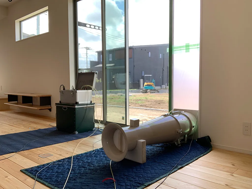C値は、実際の建物が完成した後に専門的な測定機器を使って計測されます。測定は、建物の窓やドアをすべて閉じた状態で、室内の空気を強制的に吸い出し、家の外と中の気圧差を生じさせ、その差によってどれだけ空気が隙間から漏れるかを測定する方法です。この気密測定を通じてC値が算出され、その数値をもとに家の気密性能が評価されます。