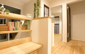 廊下や階段部分のデッドスペースを有効活用し、本棚を作り、共有のライブラリースペースとして使用できます。