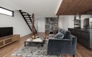 開放的なリビングで優雅に寛ぐラグジュアリーモダンな無垢の家