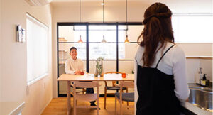 ダイニングはフロアの高低差でゾーニングされているため、壁がないので圧迫感がなく開放的な空間です。家族の声も通り、コミニュケーションがとりやすい間取りです。効果的な窓の配置で、部屋全体が明るい設計になっています。
