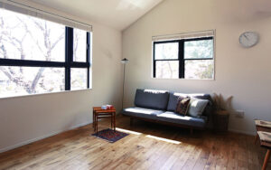 勾配天井の2階リビングのあるナチュラルモダンの無垢の家