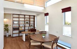 ダイニングはフロアの高低差でゾーニングされているため、壁がないので圧迫感がなく開放的な空間です。家族の声も通り、コミニュケーションがとりやすい間取りです。効果的な窓の配置で、部屋全体が明るい設計になっています。