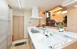 アイランドキッチンを採用し、様々な方面からアクセスしやすい間取りが人気です。作業スペースとシンクが広々として、料理の効率もアップします。巡るものがないので、家族の様子を見つつ、安心して料理や洗い物をすることが可能です。