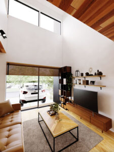 リビング上部は吹き抜けと大きな窓が設けられ、リビングで寛ぐ家族には暖かな光が降り注ぎます。
