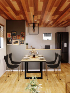 板張り天井のダイニングは、キッチンから配膳しやすく、食事をスムーズに楽しむことができます。