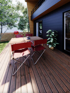 庭に突き出たウッドデッキは、アウトドアリビングとしても使え、家族や友人たちとBBQを楽しめます。