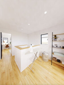 2階ホールのフリースペースは、計算された窓の配置で明るく、開放感があり、家事が捗ります。