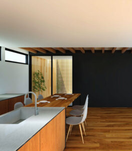 構造を工夫して柱を少なく大きな空間を実現したLDKは、視界を遮るものがなく開放的です。吹き抜けの天窓から自然光が降り注ぎます。