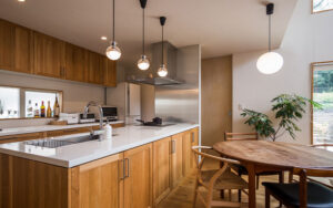 2つのワークスペースと吹き抜けリビングのあるシンプルモダンの無垢の家