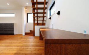 千葉県柏市 N様の無垢の家は、高台の変形地を生かしたグレーの塗り壁に木目の斜め袖壁がスタイリッシュなシンプルモダンなお住まいです。 N様はお子様の誕生をきっかけに家づくりを開始。ご夫人は家具メーカーで勤務しており、無垢材に思入れがあるため、自然素材を使用している無垢スタイルに共感をいただき、土地探しから家づくりをサポートさせていただきました。