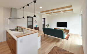 今回の見学会は、温かみのある色でまとめた外壁とベランダが印象的な2階建てのお住まいです。リビングの天井は折上げ天井となっていて、限られたスペースでありながら開放感を感じさせます。さらに、一段高く天井が上がっている分、通常は隠れている梁をダイナミックに露出。空間の中にアクセントが生まれ、デザイン性アップにも繋がりました。