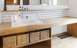 オリジナルの造作洗面はカウンタ― 仕様になっているため、アイロン台としても、奥様の化粧スペースとしても使用することができます。また、既成品を一部使用することでコスト削減にも成功しました。