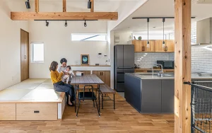 埼玉県日高市にスローライフを楽しむ自然素材住宅が完成しました。黒いガルバリウムがスタイリッシュでかっこいい2階建て。2階は子供部屋と収納メインで生活はほぼ1階で完結できる間取りです。親戚が集まる際、開放的な空間にしたいと、大きな吹き抜けを取り入れました。階段スペースに畳のベンチを合わせて、シュチュエーションにより様々な使い方ができます。他にも室内物干しが叶うランドリールーム、中二階には奥様のワークスペースを配置し、家事も仕事も快適にできる理想の家をぜひこの機会にご見学ください。