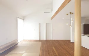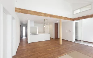 今回の見学会は、勾配天井とガラス戸で、明るく開放的な空間となった平屋のお住まいです。年齢的にもそろそろ夢のマイホームを実現したいとお考えだったM様は、無垢スタイルのモデルハウスで赤松のフローリングに一目惚れ。営業担当スタッフの印象がとても良かったことも決め手となり、当社での家づくりをお決めいただきました。家の中心にアイランドキッチンを配置することで回遊性が高く、どの部屋へもアクセスしやすい家事ラクな動線を叶えました。「LDKを少しでも広く見せる為に土間をガラスで仕切ったのが最高にお気に入りです。天井高を高くしたのも大正解でした。リフォームも手掛けているからこその発想がたくさんあると実感しました」とM様。平屋にこだわって建てて良かった、とご満足いただけているご様子です。「スピーディーに色々な事に対応いただきとても良い印象でした。資金計画などもご丁寧に話して頂いた事が1番分かりやすかったと思います。親身になって色々なことを一緒に考えていただき、楽しく家づくりができました」と嬉しいお言葉もいただきました。ぜひ、M様の素敵なお住まいと生の声を、ご自身の家づくりの参考にしてください。