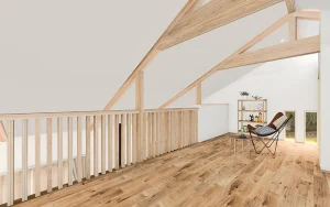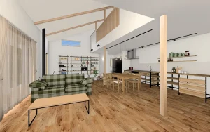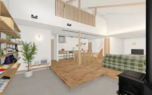 開放感あふれる勾配天井と薪ストーブのある自然素材住宅