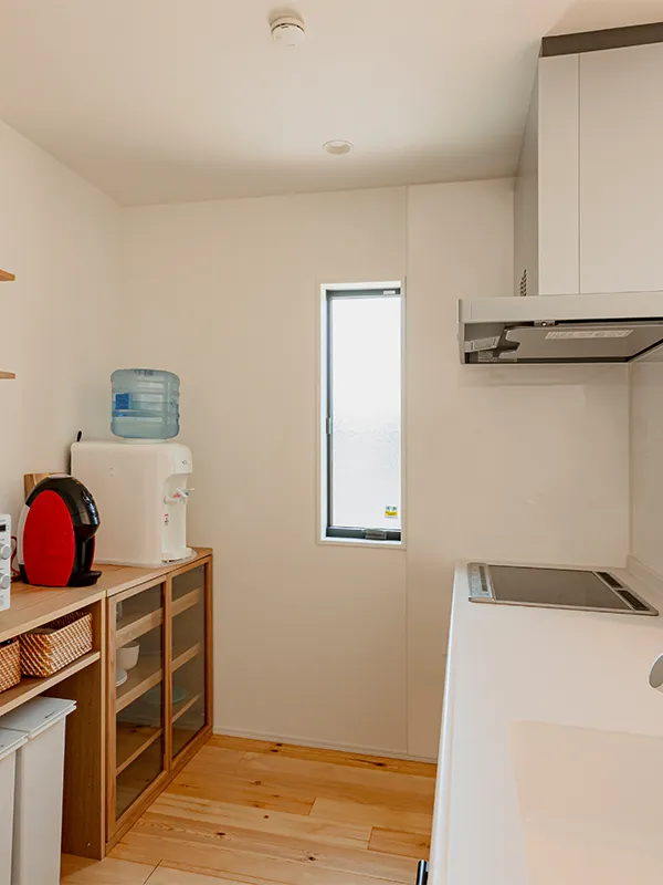 収納も十分な使いやすいキッチン。対面式で開放感があり、リビング越しに庭まで目が届くのでお子様を見守りながら家事ができて安心です。