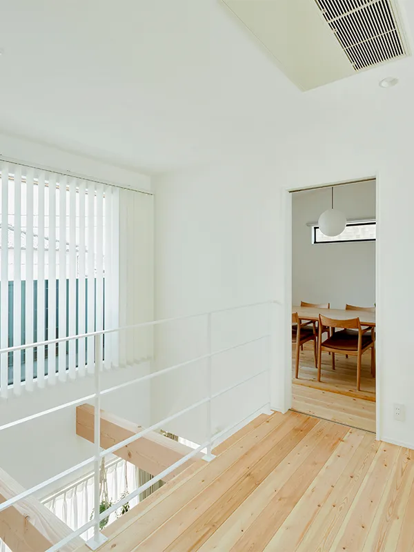 2階のホールには、物干しとアイロンがけなど家事がしやすいフリースペースがあります。計算された窓の配置で明るく、開放感も◎