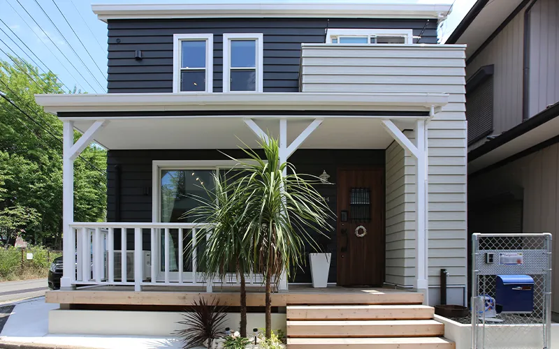 カバードポーチと吹き抜けがある開放的な家