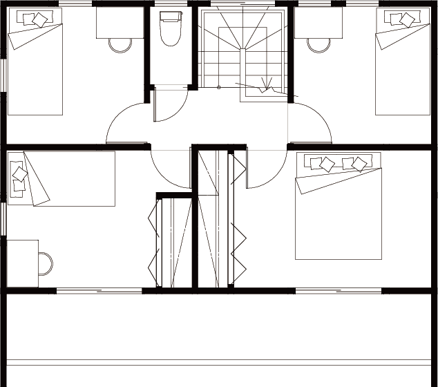 2階は寝室・洋室が計4部屋あり、家族それぞれのプライベートルームとして、また仕事や趣味などの用途によって最適な環境を設けて過ごすことができる空間です。フロアの中央に階段とトイレを設けることで、どの部屋で過ごしていても不便を感じることのない生活導線を確保した快適な間取りとなっています。うち2部屋はバルコニーでの往来も可能です。