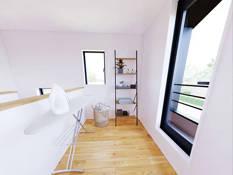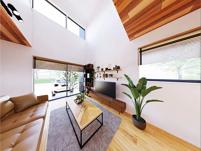 リビング上部は吹き抜けになっており、その吹き抜け2階部分には大きな窓が設けられ、リビングで寛ぐ家族には暖かな光が降り注ぎます。大空間で過ごす時間はとても有意義な時間となることでしょう。