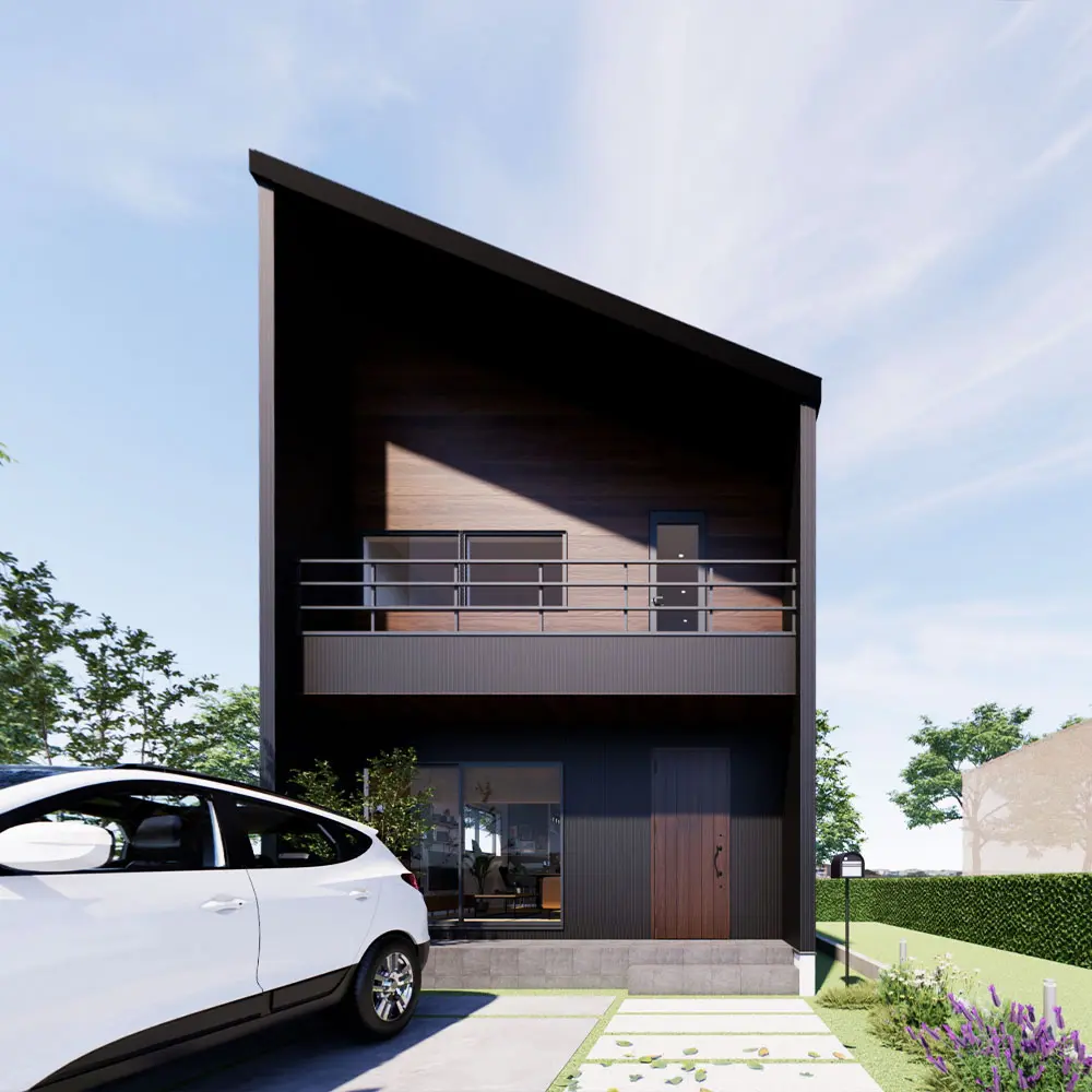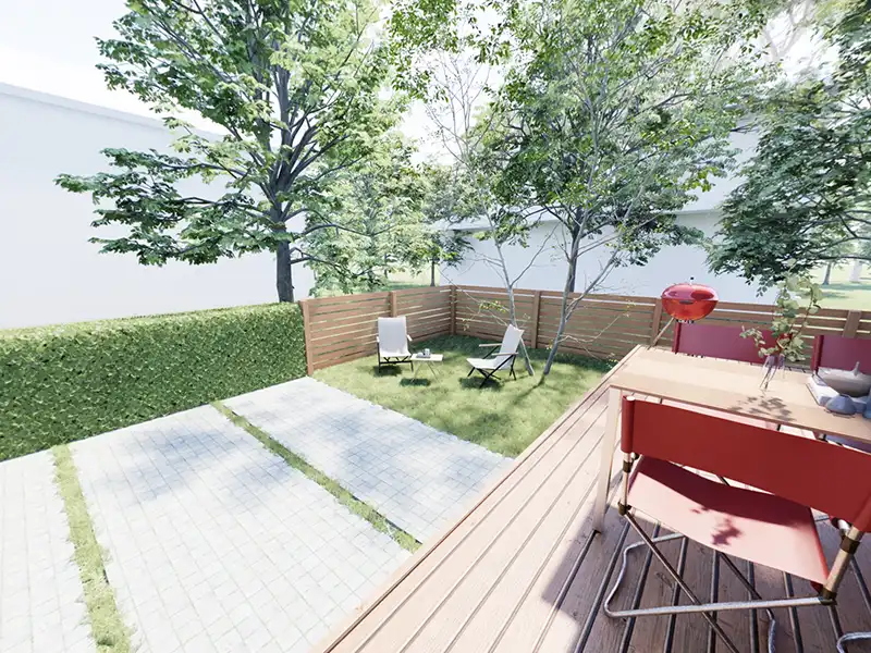 庭に突き出た1階のウッドデッキバルコニーは、アウトドアリビングとしても使える万能のスペースとなります。庭で家庭菜園をつくることでプライベートなエクステリアライフを楽しむことができます。
