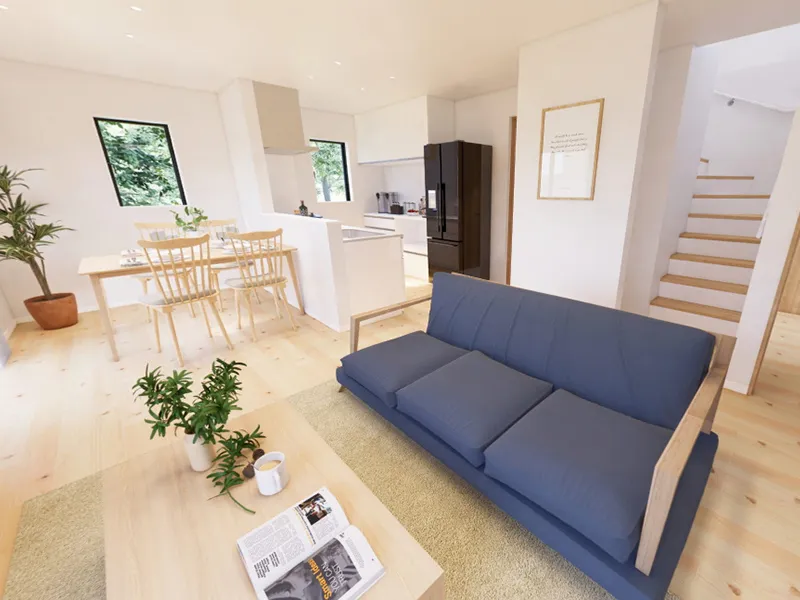 無垢ファミリアはリビング階段を採用。玄関を開けたらまずリビングを通るため、いつでも家族のみんなと顔を合わせることになります。リビングが家族の憩いの空間となるため、コミュニケーションも活発になり、いつも家族のつながりを感じることができます。また、階段がリビングのアクセントとなりおしゃれでスタイリッシュな空間も実現します。