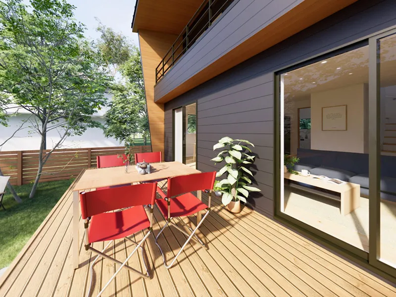 1階にテラスを設けることで、リビングから繋がる一体型の大空間を生み出すことができます。休日はご家族やご友人とBBQをしたり、お子様やペットの遊び場としたり、ハンモックでうたた寝なども実現可能です。ウッドデッキの素材はお好みに合わせ、本物の木の温もりを感じられる天然木や、木の風合いを残しながら耐久性にも優れた人工木などからお選びいただけます。