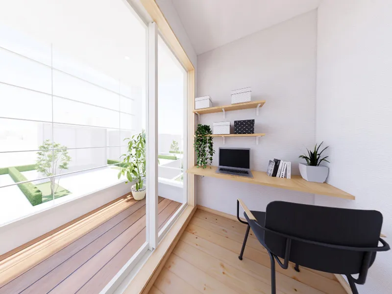 2階の広々としたホールには、テレワークや趣味に集中できるフリースペースを設けました。バルコニーに面しているため、明るく開放的な空間で、窓の外を眺めたり、外の空気を吸ってリフレッシュしながらお過ごしいただけます。また、家族みんなが使いやすいパブリックな空間なのでフレキシブルなセカンドルームとしてもご活用いただけます。