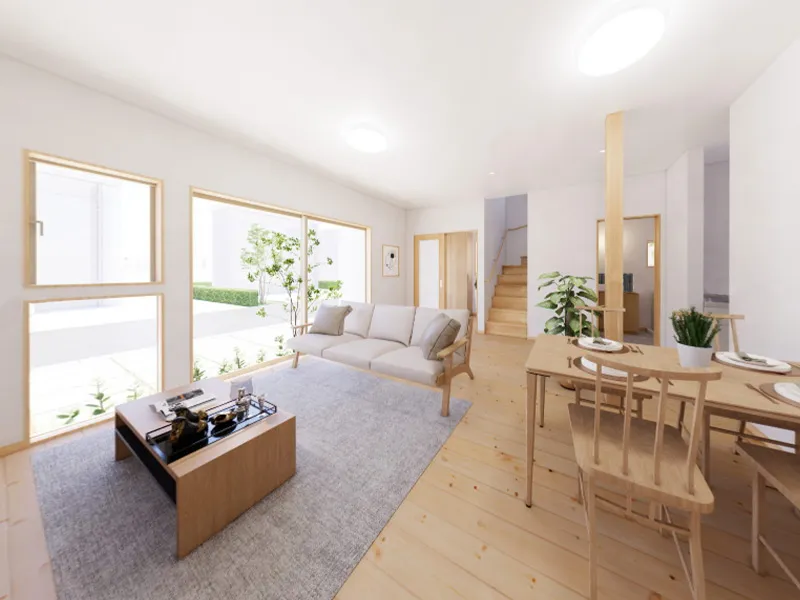 玄関を抜けたらまず快適なリビングが広がります。リビング階段のため、家族が帰って来ると必ず顔をあわせることができ、コミュニケーションも活発に。広々とした快適なリビングで家族団欒の時間を楽しむことができるほか、しっかりとした客間として利用できるコンパクトな和室も備えています。