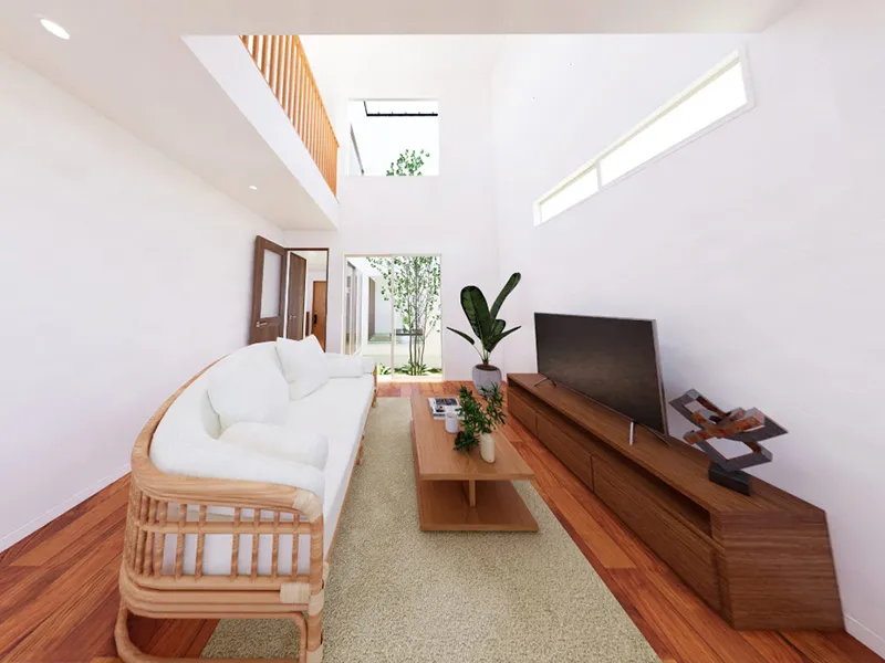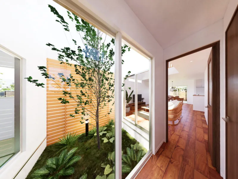 住むひとに精神的な豊かさと安らぎを与えてくれる中庭。家の内側から自然の清々しさを感じられる素敵な空間となります。吹き抜けから光が降り注ぐ独特な開放空間は、家族共通の和みスペースとしてピッタリです。また、中庭は採光をたっぷりとれる上、プライバシー性が高く、住宅密集地におすすめです。光や風、雨さえもインテリアの一部として取り入れることができる中庭のあるプランです。