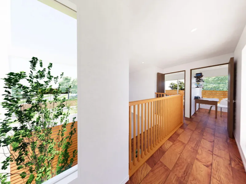 階段を上がると大きなFIX窓から周囲の風景を眺めることができる2階ホール。橋のような廊下からは吹き抜けを通して1階で寛ぐ家族を感じることができます。また、2階ホールのほか、2階のそれぞれの洋室にもバルコニーが設置されているので、どこでも気軽にプライベートな時間を楽しむことも可能です。