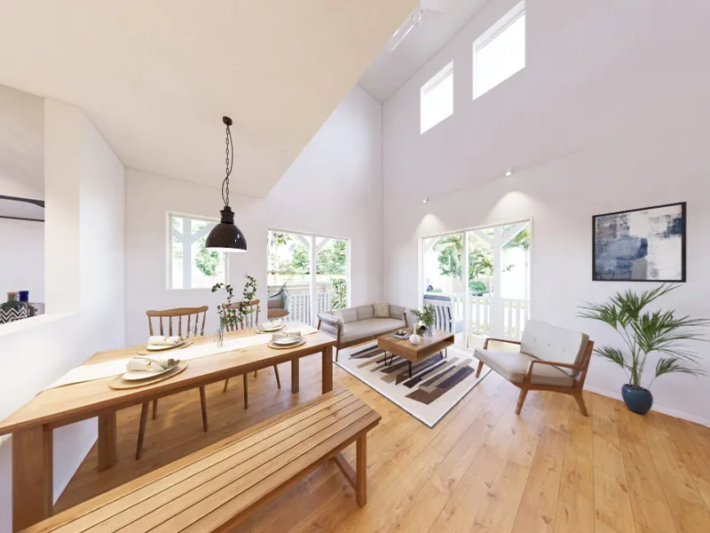 玄関と一体となったLDKは、シーリングファンを設けた高さのある勾配天井が魅力。高い位置にある窓から差し込む優しい太陽の光と柔らかな空気が部屋全体を包み込みます。また、リビング階段なので家族と顔を合わせる機会も増え、リビングが活発な家族のコミュニケーションが交わされる場所になります。