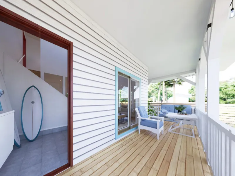 アメリカンスタイルの家の代名詞とも言える、憧れのカバードポーチ。無垢サーファーズスタイルは、リビング・ダイニングと一体の空間になるように、室内を囲むように2面にデッキを設けました。ハンモックでお昼寝を楽しんだり、子供の水遊び場としたり…。毎日リゾート気分を味わえます。