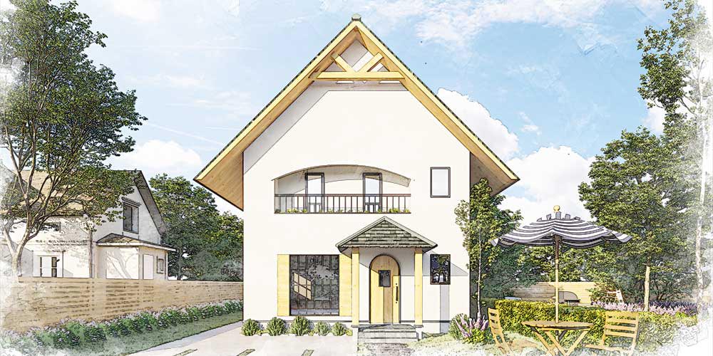 自然と調和した北欧デザインは、まるでおとぎ話から飛び出してきたようなフレンチカントリーな住まい。素朴な中にもどっしりとした重厚感がある佇まいであり、自然との調和を乱さないように、自然素材が多く使われるのも特徴のひとつ。また、急勾配になっている三角屋根が、何ともかわいらしく目をひきます。