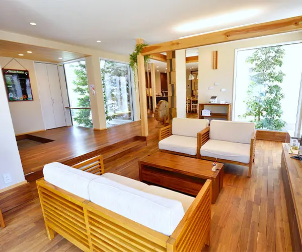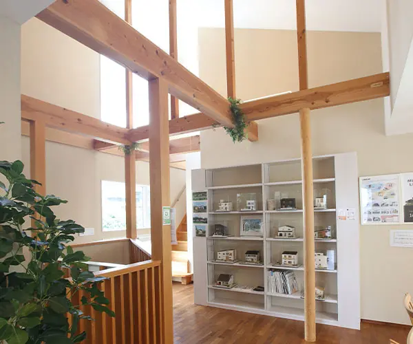 次世代全館空調システムを体感できるモデルハウスです。ステップダウンフロアで空間に立体感をもたせメリハリのある間取りとなっています。こちらのスペースでお打ち合わせが可能です。