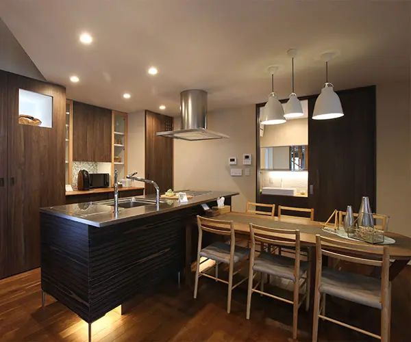 広々としたダイニングスペースに憧れのアイランドキッチンが設けております。スタリッシュなキッチンに温かみのある天然木のダイニングテーブルが調和し、家族で食事時間を楽しむことができます。