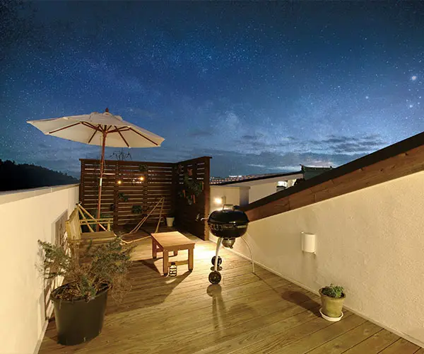 屋上のある間取りなら、庭が持てなくても、家族や仲間と一緒にバーベキューを楽しむことができます。こちらのモデルハウスの屋上では、ウッドデッキのテラスからは満点の星空を鑑賞できます。