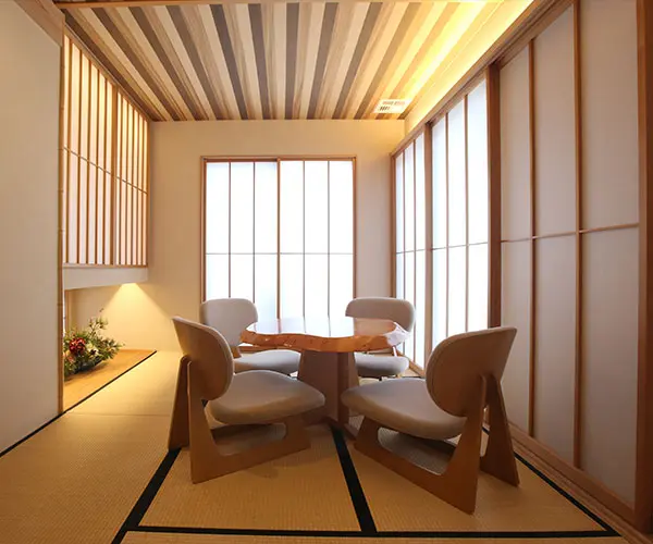 ダイニングに隣接したアールの垂れ壁を入ると、6畳ほどの和室があります。座椅子と円形の座卓で床座の暮らしが楽しめます。おしゃれな天井クロスと和室が調和し、和モダンな雰囲気に洗練されています。