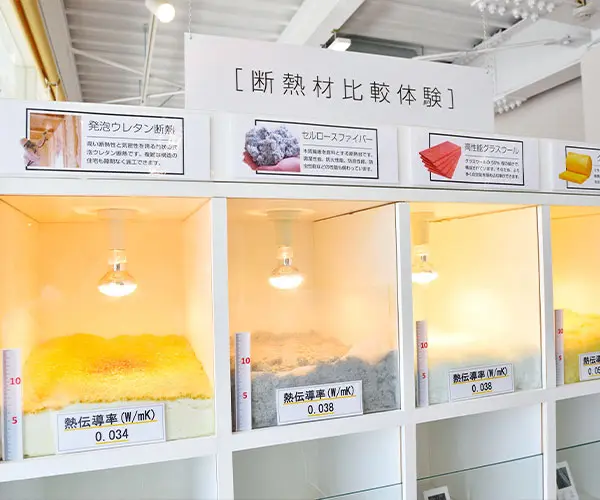 日本の住宅でよく使用される断熱材が展示されています。「グラスウール」「高性能グラスウール」「発泡ウレタン」「セルロースファイバー」「ロックウール」の熱伝導率がわかります。断熱材がどのくらい熱を遮るのか比較装置を展示しています。