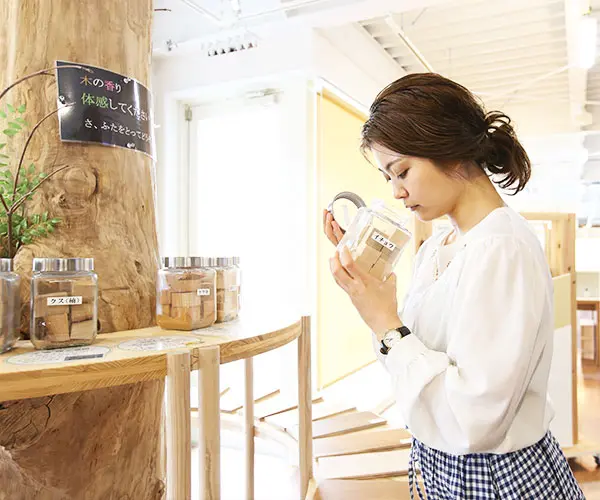 天然・無垢材の木である「楠」「ケヤキ」「青森ヒバ」「イチョウ」などの芳香を体感していただけます。木の香りときれいな空気に包まれる空間で癒されながら、ぜひお気に入りの無垢材を探してみてください。