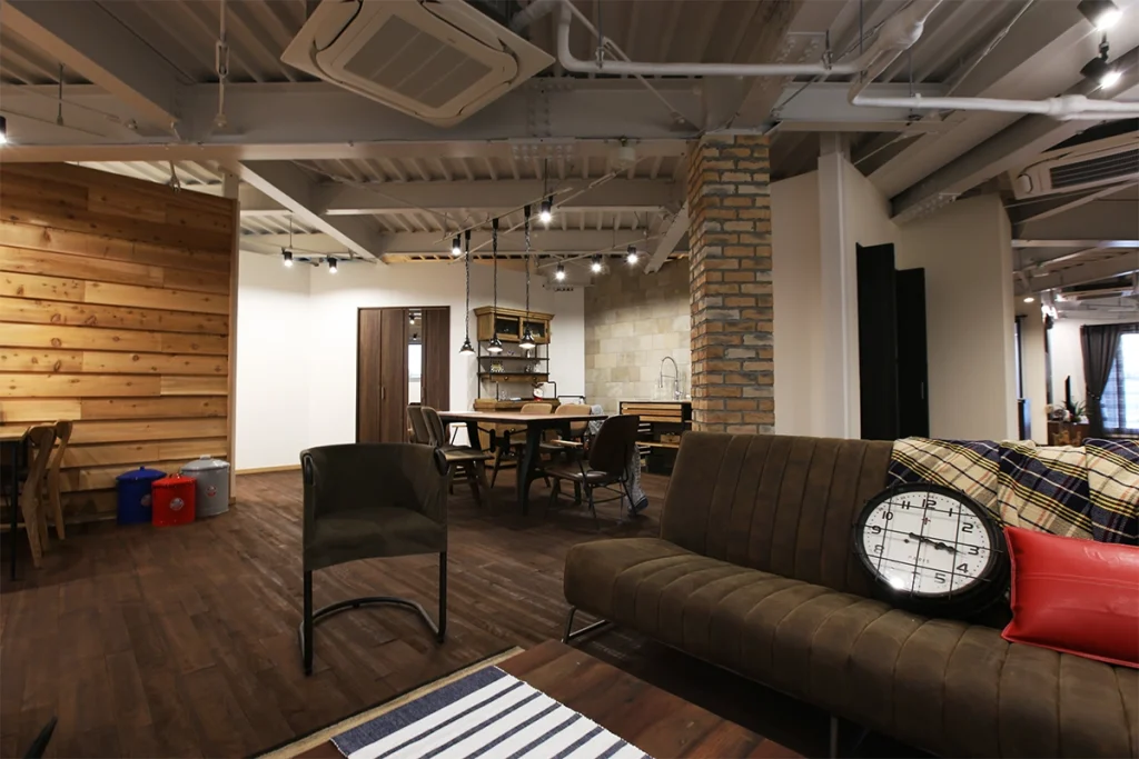 黒や茶色の重厚感のあるカラーや無骨でラフな素材で雰囲気のあるアメリカンヴィンテージスタイルエリアです。飲食店に多く、女性にも人気のスタイルです。