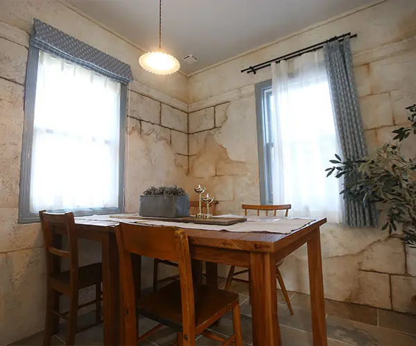 キッチンに隣接した一角のスペースにダイニングスペースがあります。キッチンからダイニングスペース、リビングルームと回遊できる間取りとなっております。モルタル造形のタレ壁で空間をさりげなく仕切ることで、部屋全体の開放感を損なうことなく、別空間を演出します。
